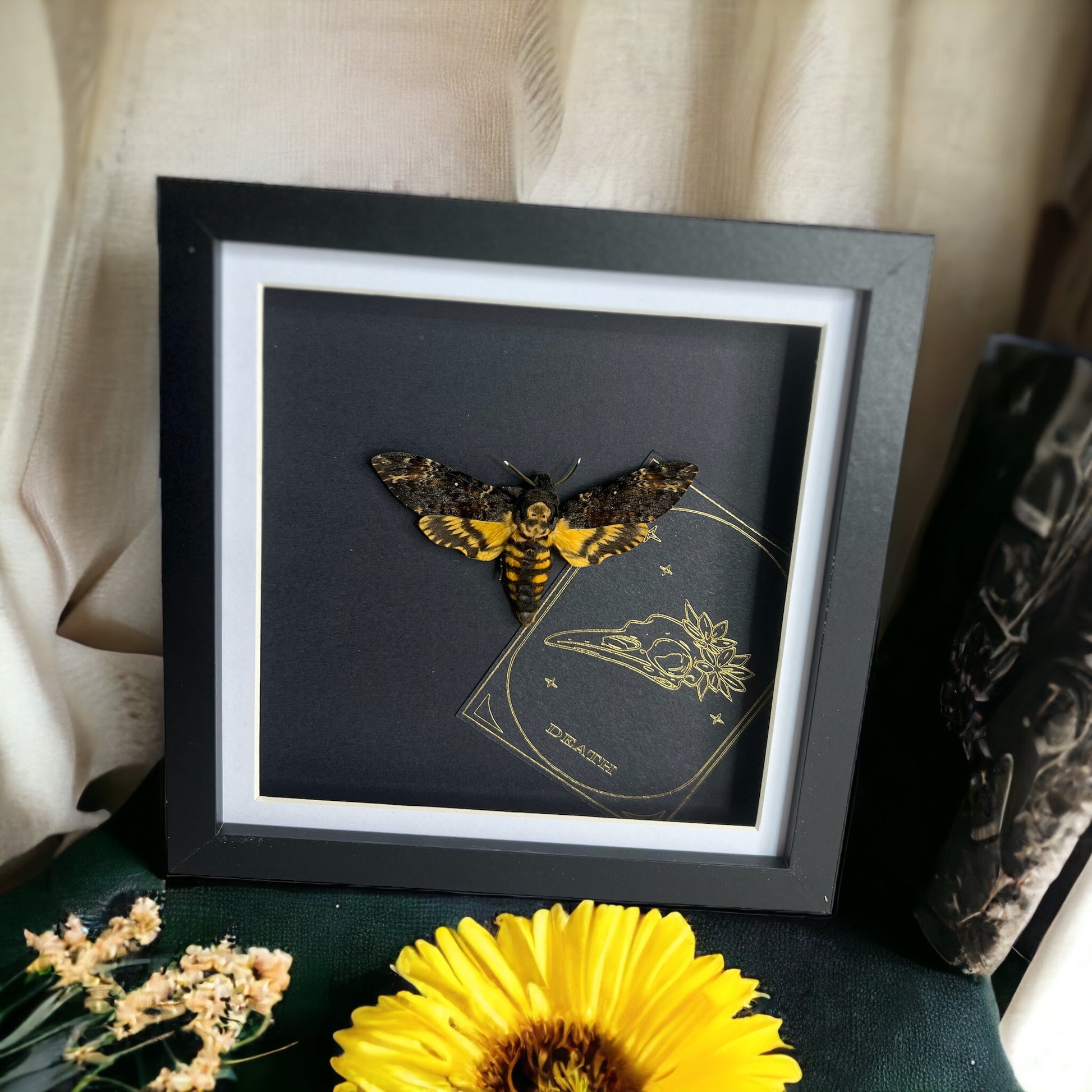 Ethically sourced species that has lived its full life. This species is found in Europe and throughout Africa. This species of the death's-head hawkmoth (Acherontia Atropos) is the largest moth in the British Isles. These moths are easily distinguishable by the vaguely human skull-shaped pattern of markings on the thorax. These moths are enjoyed by tattoo and film lovers alike. Handed pinned, mounted and framed. Black or white Shadow box frame available. Frame size 20cm x 20cm x 3cm