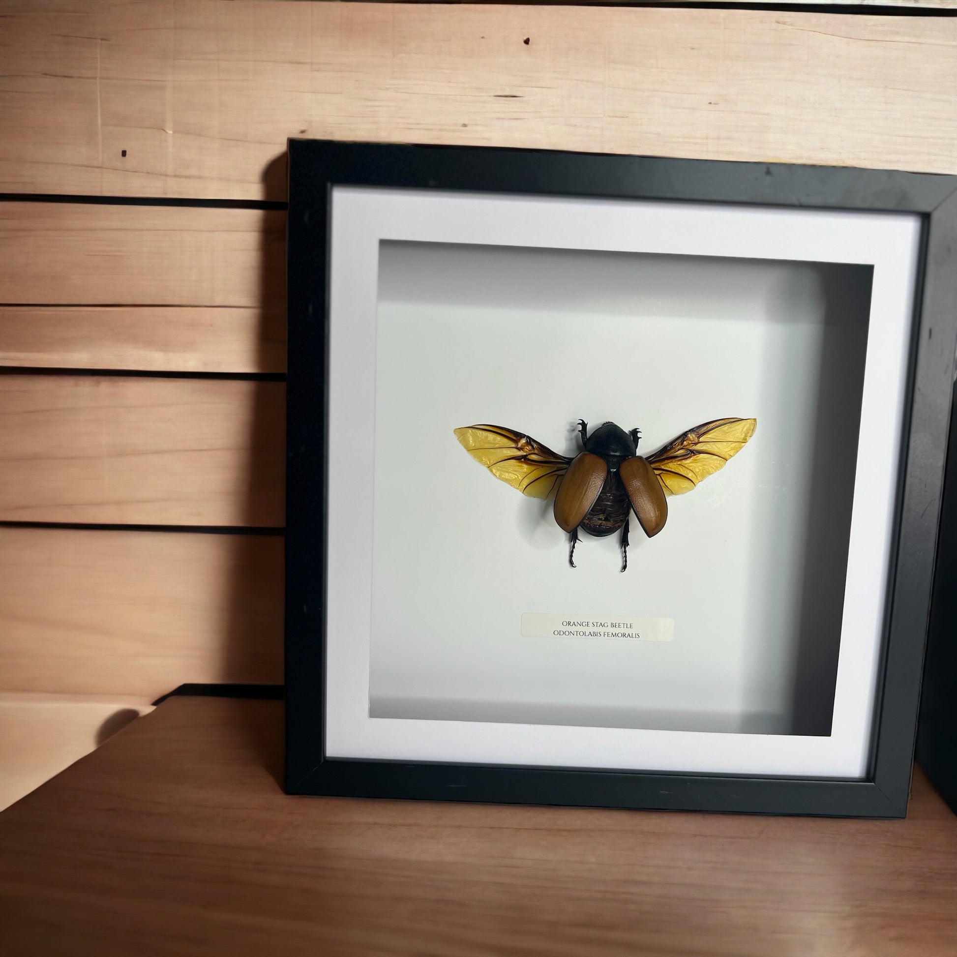 Ethically sourced species that has lived its full life. This species is native to the forests of Southeast Asia. Hand pinned, mounted and framed. Black or white Shadow box frame available. Frame size 27cm x 27cm x 6cm